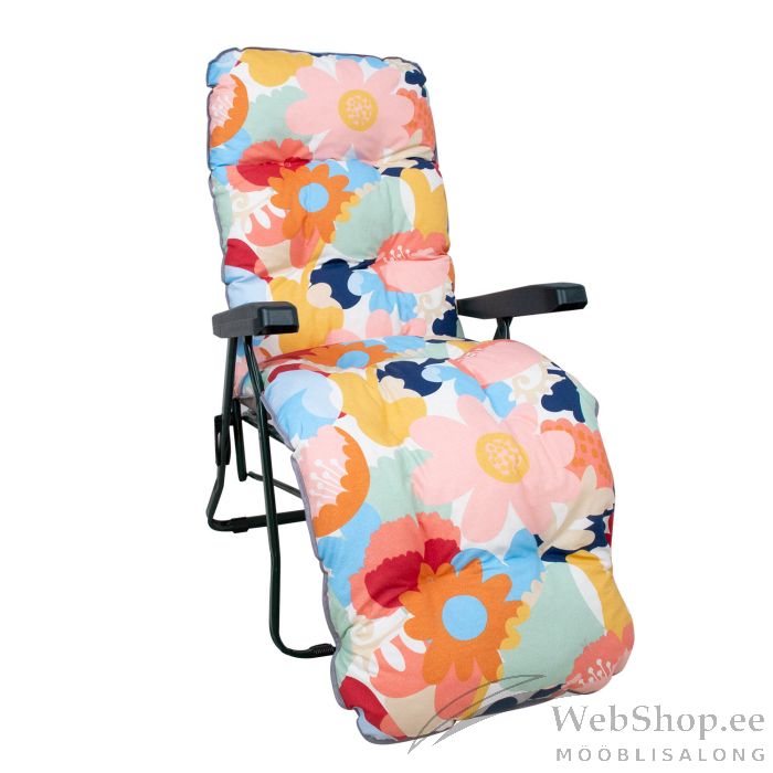 Lamamistool BADEN-BADEN istmekattega. Tooli raam on valmistatud metallist ja viimistletud rohelise pulbervärviga. Istme ja seljatoe toestuseks on siksak vedrud. Lamamistooli selja- ja jalatugi on reguleeritav. Jalatugi liigub seljatoega sünkroonis. Seljatoe reguleerimiseks tõstke käetoed üles, valige sobiv asend ja fikseerige käetoed. Võimalik on valida viie erineva positsiooni vahel. Kokkupanduna on tooli lihtne kaasa võtta või hoiustada. Toolikate BADEN-BADEN 48x165cm, põhjamaised lilled. Kattematerjal: 20% polüester, 80% puuvill, kangas 332. Täidis: purustatud poroloon. Tooli üldmõõdud on 57x86xH100cm. Istme laius 47cm, istme sügavus 50cm, istme kõrgus 43cm. Kaalupiirang 100kg. Tooli mõõdud kokkupanduna 57x88x14cm. HOOLDUS: toolikatte masinpesu ei ole soovitatav.