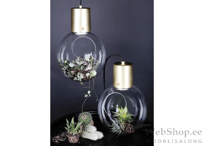 Klaasist kupliga lamp. Võimalik kasutada nii laua- kui ka laelambina. Kupli keskel on auk, kuhu on võimalik sisse panna soovi järgi erinevaid esemeid. Tekstiilist kaabel pikkusega 350 cm. Sobib elektripirn max 25W, sokliga E14. Elektripirn ei kuulu komplekti.