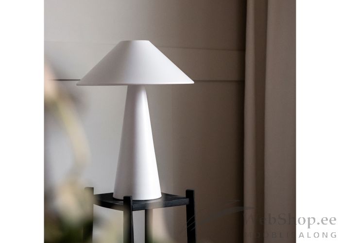 Stiilne ja trendikas matt valget värvi metallist laualamp. Lamp annab modernse tunde. Lambile sobib elektripirn max 60W, sokliga E27. Valgusallikas ei kuulu komplekti. Lambil on 200cm pikkune valge tekstiilist kaabel koos lülitiga. Skandinaavia disain.
