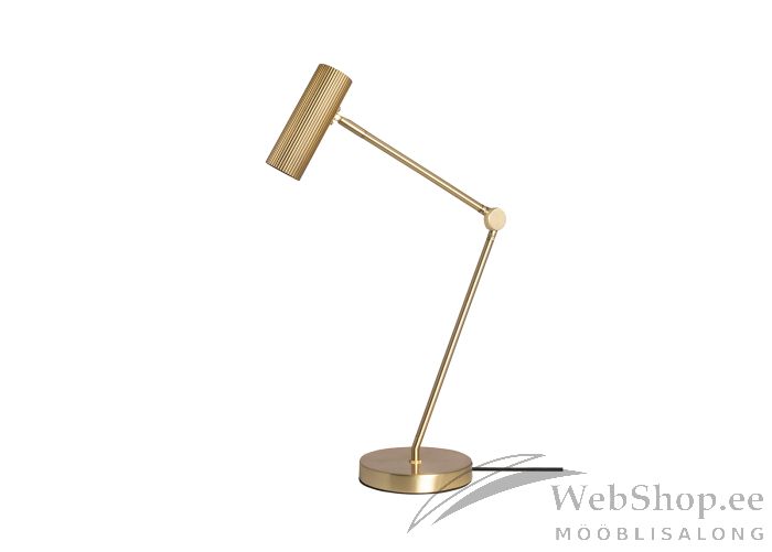 Harjatud messingu tooni metallist laualamp. Must tekstiilist kaabel (200cm). Lambile sobib elektripirn max 28W, sokliga GU10. Valgusallikas ei kuulu komplekti. Lüliti asub kaabli peal. Lamp on suunatav. Skandinaavia disain.