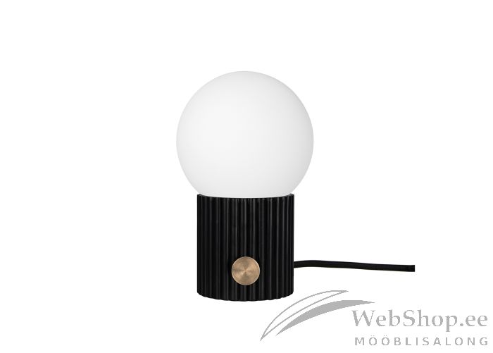 Musta värvi polüresiinist ja klaasist kupliga laualamp. Must tekstiilist kaabel. Lüliti asub lambi peal. Lambile sobib elektripirn max 40W, sokliga E14. Valgusallikas ei kuulu komplekti. Valgusvoo reguleerimise võimalus (ei kuulu komplekti). Skandinaavia disain.