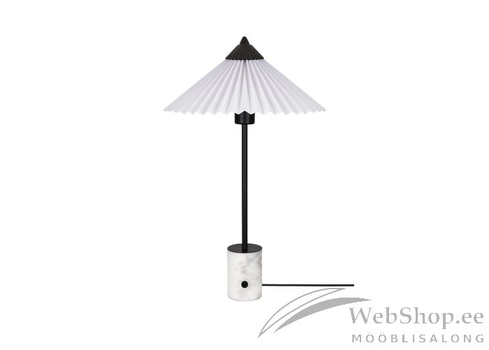 Modernse välimusega laualamp. Musta värvi metallist ja marmorist jalg. Valge tekstiilist kuppel. Sobib elektripirn max 60W, sokliga E27. Valgusallikas ei kuulu komplekti. Lüliti asub lambi peal.