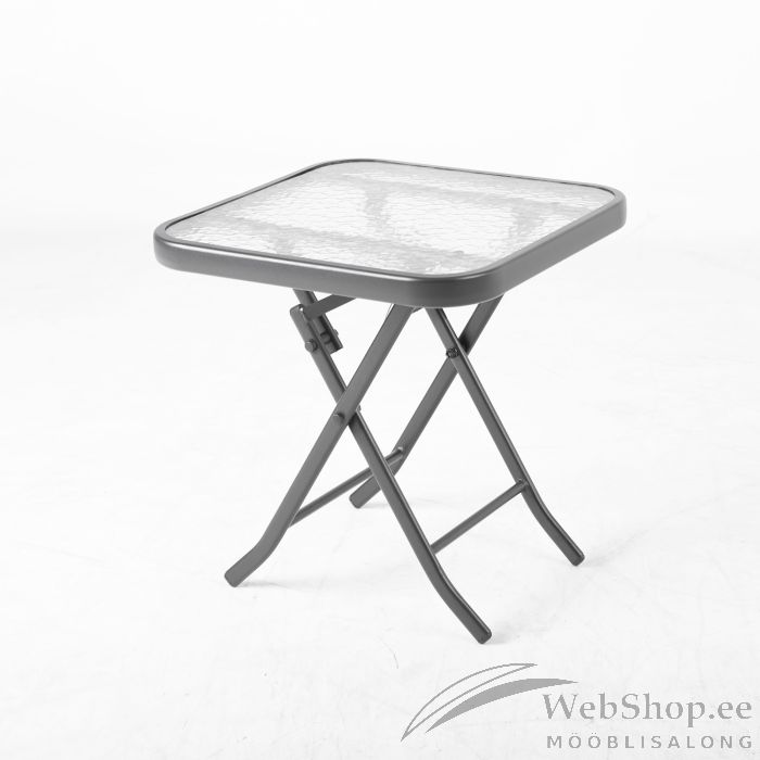 Laud DUBLIN 46x46x46cm, kokkupandav. Lauaplaat: 5mm läbipaistev laineline klaas. Laua raam ja jalad on valmistatud terasest ja viimistletud musta pulbervärviga.