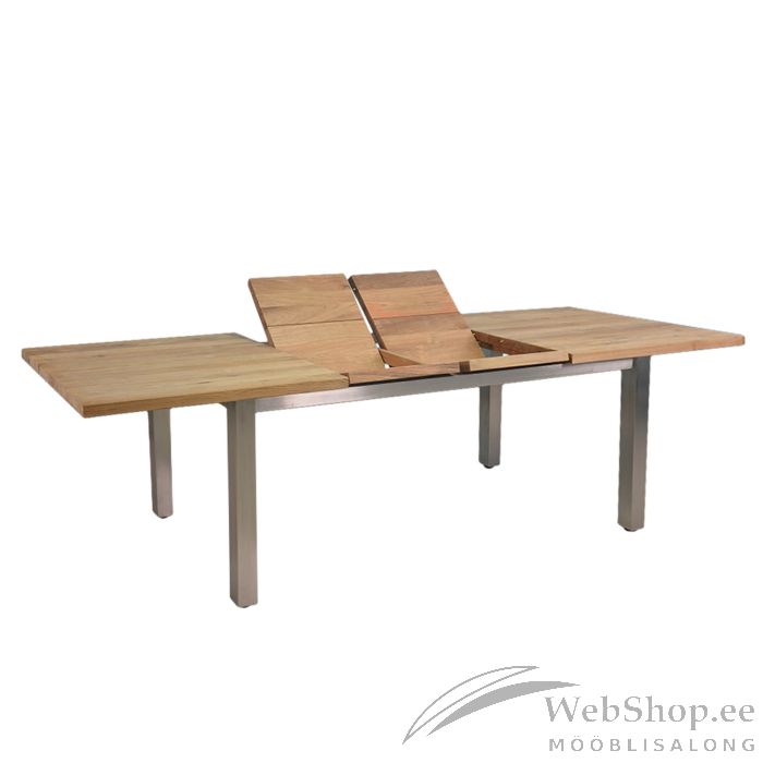 Laud NAUTICA 200/250/300x100xH76cm, tiikpuu. Laud on keskelt pikendatav. Kaks 50cm laiust keskelt kokku klapitavat pikendusosa asuvad lauaplaadi all. Lauaplaat on valmistatud A-klassi tiikpuust. Peenlihvitud rustik viimistlusega pind on täielikult naturaalne oma looduslikus ilus ning seda ei ole õlitatud ega muul viisil keemiliselt töödeldud. Laua jalad ja alusraam on valmistatud roostevabast terasest. A-klassi tiikpuu on täiuslik looduslik materjal luksusliku õuemööbli valmistamiseks. Puidu süü on tihe ja ühtlane ning kauni sametise läikega, värvus on kuldse nisu-ja meetoonides. Tänu suurele looduslike õlide sisaldusele on tiikpuu väga vastupidav niiskuse ning puidukahjurite suhtes. Tiikpuu talub väga hästi erinevaid ilmastikutingimusi ja säilitab oma suurepärase välimuse ja parimad omadused pikkadeks aastateks. Päikesevalguse ja niiskuse mõjul muutub laua pind aja jooksul kaunilt hõbehalliks. Selline värvimuutus on loomulik ning ei mõjuta puidu kvaliteeti. Eksklusiivne tiikpuidust laud sobib suurepäraselt kasutamiseks ka siseruumides. HOOLDUS: puhastage mööblit regulaarselt, kaitske liigniiskuse ja UV kiirguse eest. Puidust pindade värskendamiseks võib need soovikorral kergelt üle lihvida. HOIUSTAMINE: suvehooaja lõppedes soovitame aiamööblit hoiustada siseruumides. Puhastage ja kuivatage mööbel enne hoiule panekut. Kasutage hoiustamiseks kuiva ning hea ventilatsiooniga ruumi.