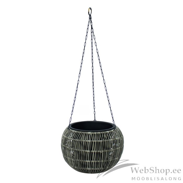 Lilleampel WICKER D32xH22cm, hall. Lillepoti metallraam on kaetud plastikpunutisega. Plastikust sisepoti mõõdud on D21xH20cm. Sisepott on ilma auguta. Mustad metallist riputusketid 57cm.