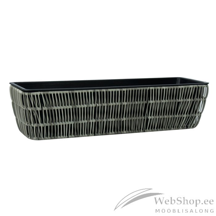 Lillekast WICKER 60x19xH15cm, hall. Lillekasti metallraam on kaetud plastikpunutisega. Lillekasti sees on plastikust sisepotti mõõtudega 56x16xH13cm. Sisepott on ilma auguta.
