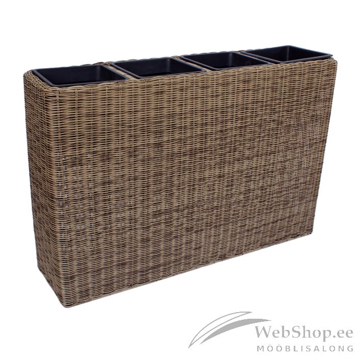 Lillekast WICKER 89x24xH60cm, helepruun. Lillekasti metallraam on kaetud plastikpunutisega. Kasti sees on 4 plastikust sisepotti mõõtudega 17,5x17,5xH16cm. Sisepotid on ilma auguta.