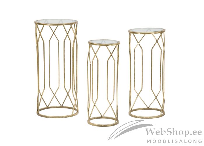 Stiilne kuldset tooni metallist lillepostamendid. Komplekti kuulub 3 postamenti. Plaadid on turvaklaasist.