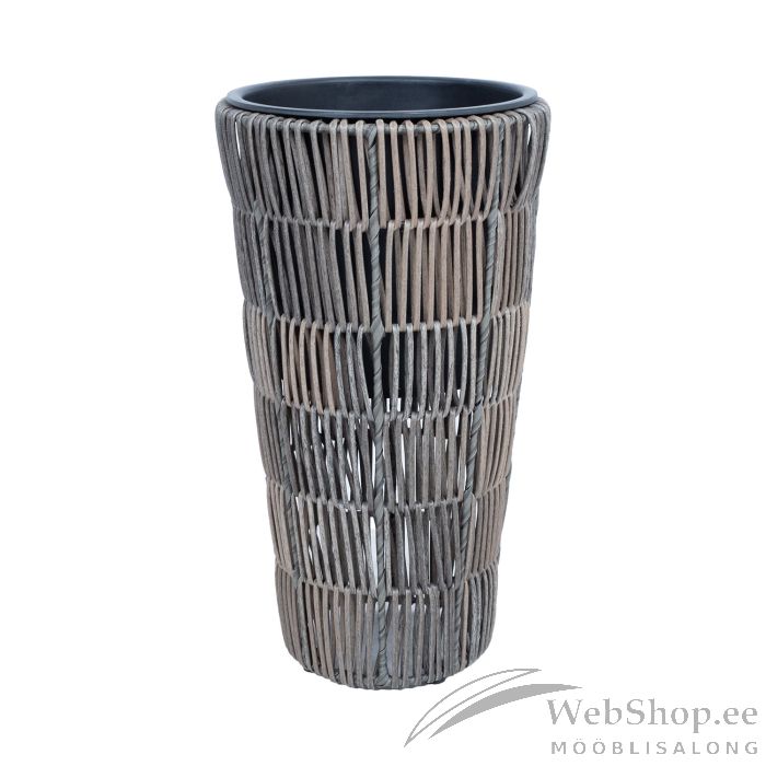 Lillepotiümbris WICKER D28xH50cm, hall. Lillepoti metallraam on kaetud plastikpunutisega. Plastikust sisepoti mõõdud on D23xH24cm. Sisepott on ilma auguta.