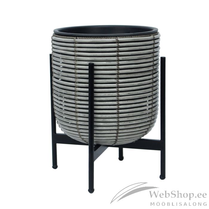 Lillepott WICKER alusega 30x30xH38cm, hall. Lillepoti metallraam on kaetud plastikpunutisega. Lillepoti mõõdud on D27xH28cm. Plastikust sisepoti mõõdud on D23xH23cm. Sisepott on ilma auguta. Komplekti kuulub must metallist alusraam.