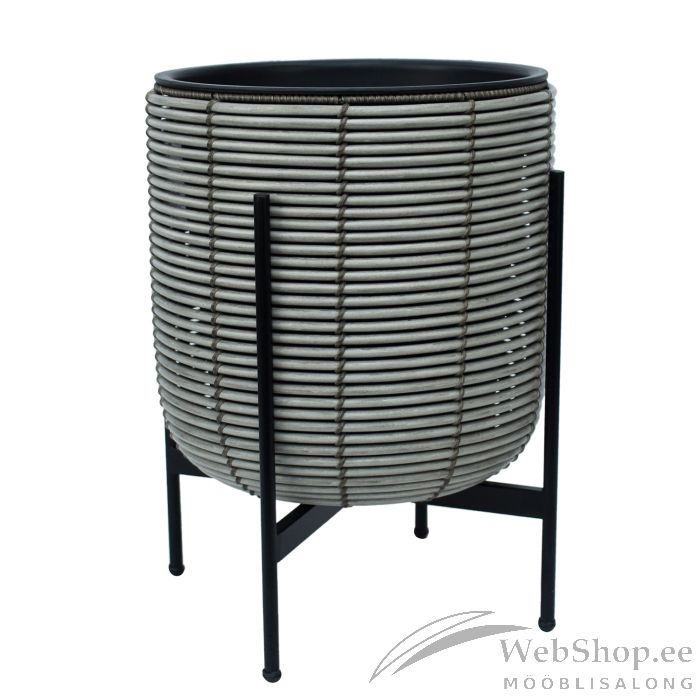 Lillepott WICKER alusega 38x38xH49cm, hall. Lillepoti metallraam on kaetud plastikpunutisega. Lillepoti mõõdud on D36xH36cm. Plastikust sisepoti mõõdud on D30xH30cm. Sisepott on ilma auguta. Komplekti kuulub must metallist alusraam.