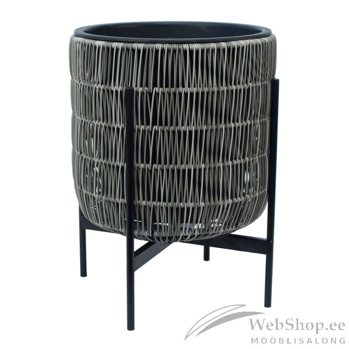 Lillepott WICKER alusega 38x38xH49cm, hall. Lillepoti metallraam on kaetud plastikpunutisega. Lillepoti mõõdud on D36xH36cm. Plastikust sisepoti mõõdud on D30xH30cm. Sisepott on ilma auguta. Komplekti kuulub must metallist alusraam.