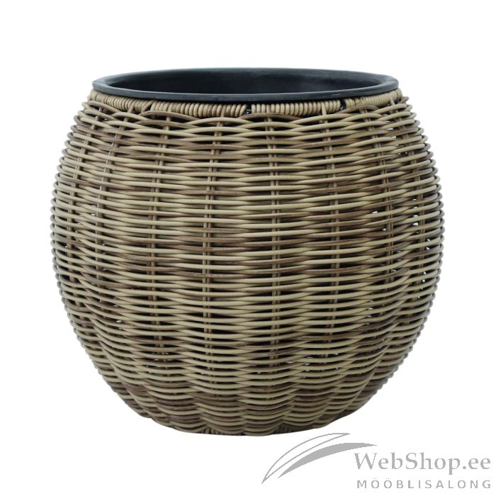 Lillepott WICKER D26xH22cm, helepruun. Lillepoti metallraam on kaetud plastikpunutisega. Plastikust sisepoti mõõdud on D17,5xH16cm. Sisepott on ilma auguta.