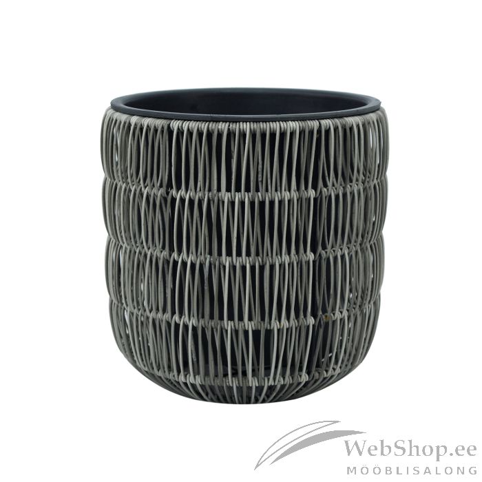 Lillepott WICKER D27xH28cm, hall. Lillepoti metallraam on kaetud plastikpunutisega. Plastikust sisepoti mõõdud on D23xH23cm. Sisepott on ilma auguta.