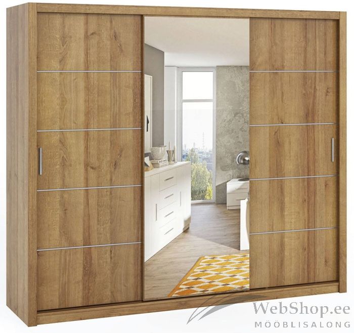 Stiilne ja funktsionaalne kvaliteetsest lamineeritud plaadist valmistatud kolme lükanduksega riidekapp. Keskmine uks on kaetud peegliga. Võimalik tellida neli eri värvi. Lisatasu eest on võimalik tellida kappi kolme sahtliga lisaboks.