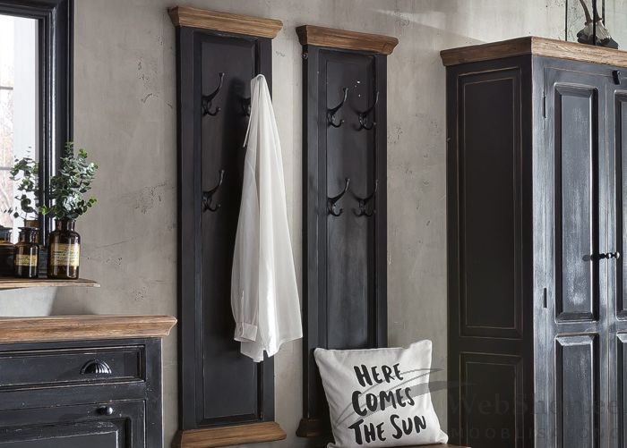 Mangopuidust ja MDF-mööbliplaadist nagi. Ülemine ja alumine äär mangopuidust, mee tooni. Viimistlus: must. 4 konksu riiete riputamiseks. Taotuslikult tehtud kulumisjäljed.