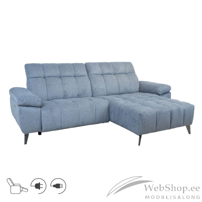 Nurgadiivan LUZERN parem nurk, elektriline reclainer, sinakashall. Kaasaegse diivani juures on funktsionaalsus sama oluline, kui välimus ja mugavus. Reguleeritav pea- ja jalatugi, USB port ja laiad käetoed tagavad suurepärase kasutamismugavuse igas olukorras ja meeleolus. Diivani peatoed liiguvad üles-alla manuaalse mehhanismi abil. Jalatoe asend on reguleeritav elektrilise mehhanismiga. Diivani karkass on valmistatud puidust ja vineerist. Polsterduseks on kasutatud polüuretaanvahtu. Diivan on üleni kaetud polüesterkangaga. Diivani üldmõõdud on 264x87/160xH85cm. Istme laius 103+103cm, istme sügavus 58/126cm, istme kõrgus 48cm. Käetoe kõrgus maast 65cm, käetoe laius 28cm. Diivanil on metallist jalad H16cm.