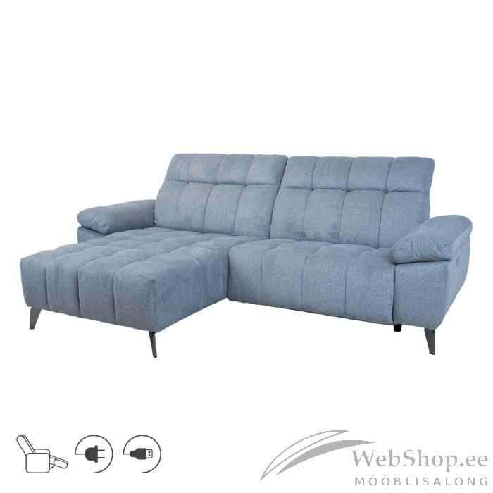 Nurgadiivan LUZERN vasak nurk, elektriline reclainer, sinakashall. Kaasaegse diivani juures on funktsionaalsus sama oluline, kui välimus ja mugavus. Reguleeritav pea- ja jalatugi, USB port ja laiad käetoed tagavad suurepärase kasutamismugavuse igas olukorras ja meeleolus. Diivani peatoed liiguvad üles-alla manuaalse mehhanismi abil. Jalatoe asend on reguleeritav elektrilise mehhanismiga. Diivani karkass on valmistatud puidust ja vineerist. Polsterduseks on kasutatud polüuretaanvahtu. Diivan on üleni kaetud polüesterkangaga. Diivani üldmõõdud on 264x160/87xH85cm. Istme laius 103+103cm, istme sügavus 58/126cm, istme kõrgus 48cm. Käetoe kõrgus maast 65cm, käetoe laius 28cm. Diivanil on metallist jalad H16cm.