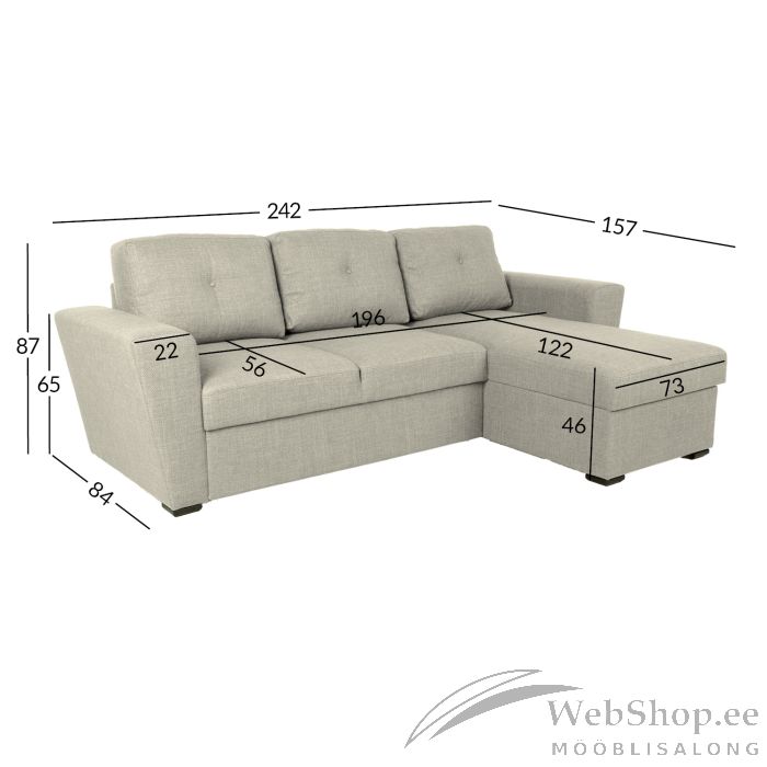 Diivani üldmõõdud on 242x157xH87cm. Istumissügavus on 56cm, istumiskõrgus 46cm. Magamisosa mõõdud avatuna 150x196cm.