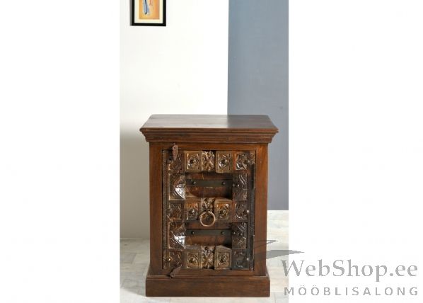 Ümbertöödeldud puidust valmistatud kvaliteetne koloniaalstiilis pruun öökapp. Metallhingedel uks. Uksel on metallkäepide. Ukse sulgemiseks on 2 sulgurit. Tootele on taotluslikult tehtud kulumis- ja kasutamisjäljed. Uks ning nikerdused on valmistatud käsitööna kunagiste Rajasthani provintsi käsitööliste eeskujul.