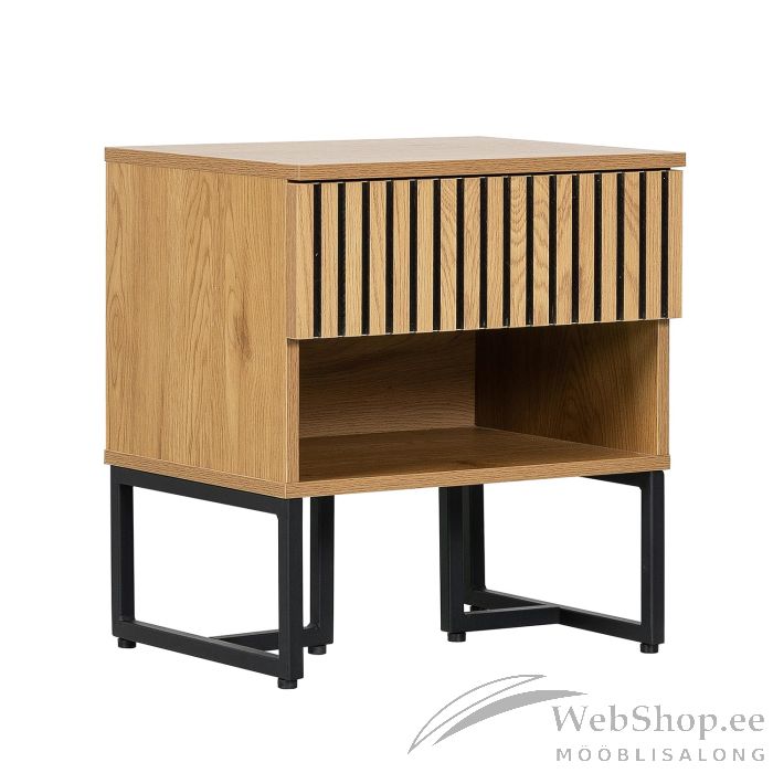 Öökapp HAMPTON sahtli ja avatud riiuliga 50x40xH55cm. Öökapi korpus on valmistatud tammedekooriga melamiinplaadist. Sahtli esipaneeli kaunistavad kitsad tammevärvi MDF liistud mustal taustal. Sahtel liigub metallsiinidel. Öökapi metallist alusraam on viimistletud musta pulbervärviga.