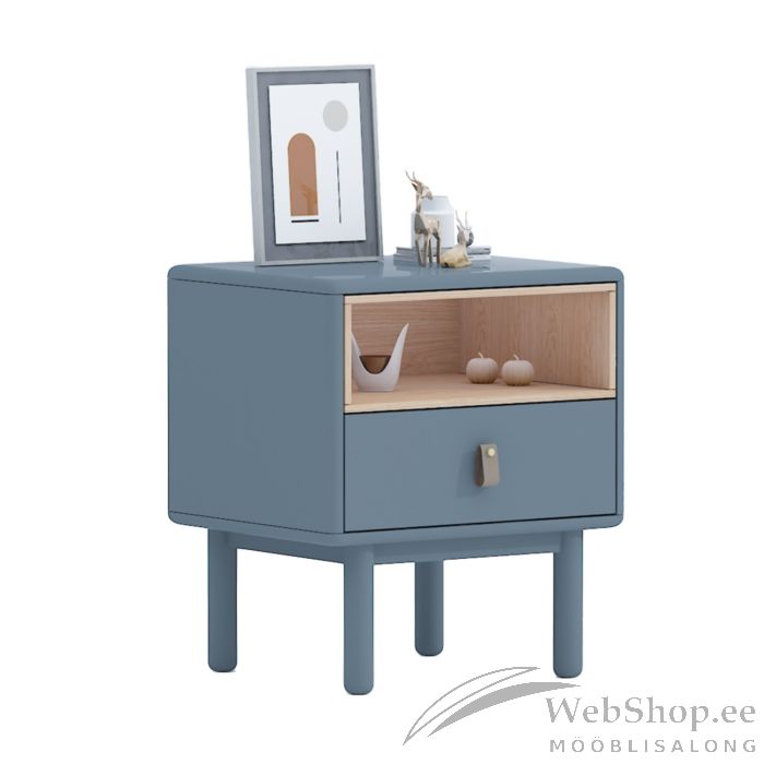 Öökapp IRIS sahtli ja riiuliga 48x40xH55cm, hall. Öökapp on valmistatud 18mm MDF plaadist. Jalad ja alusraam on valmistatud täispuidust. Kummut on viimistletud vastupidava polüuretaanvärviga. Sahtlil on nahast käepide. Avatud vaheriiul on vooderdatud heleda puiduvärvi plaadiga. Öökapil on ümarad välisservad.
