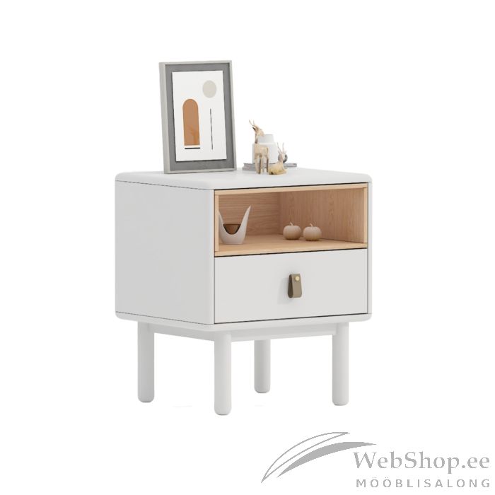 Öökapp IRIS sahtli ja riiuliga 48x40xH55cm, valge. Öökapp on valmistatud 18mm MDF plaadist. Jalad ja alusraam on valmistatud täispuidust. Kummut on viimistletud vastupidava polüuretaanvärviga. Sahtlil on nahast käepide. Avatud vaheriiul on vooderdatud heleda puiduvärvi plaadiga. Öökapil on ümarad välisservad.