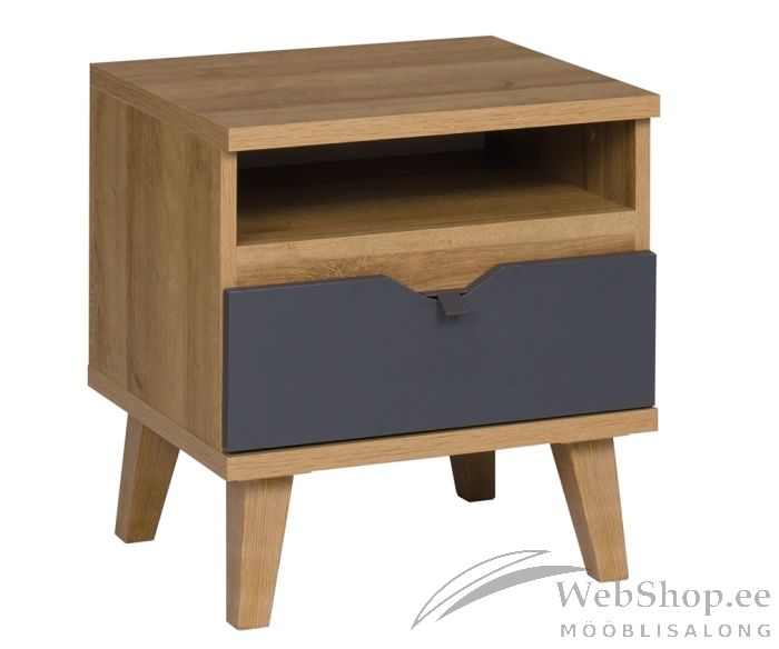 Moodne avatud riiuli ja sahtliga öökapp on valmistatud vastupidavast 16 mm paksusest laminaatplaadist.