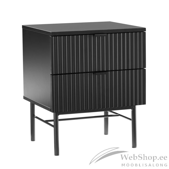 Öökapp SEQUENCE 2-sahtliga 45x40xH55cm, must. Öökapi korpus on valmistatud MDF plaadist. Reljeefse pinnaga triibulised sahtli esipaneelid annavad kapile omanäolise ja trendika välimuse. Sahtlid liiguvad metallsiinidel. Öökapp on viimistletud vastupidava polüuretaanvärviga. Metallist alusraam ja jalad on viimistletud pulbervärviga.