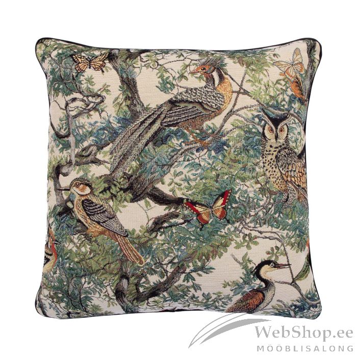 Padi HOLLY 45x45cm, linnud metsas, padjal on tõmbelukk ja padi on ääristatud rullkandiga. Kangas gobelään, 50% polüester, 50% puuvill, kangas 763. HOOLDUS: patja võib pesta temperatuuril 30 kraadi pesumasinas.