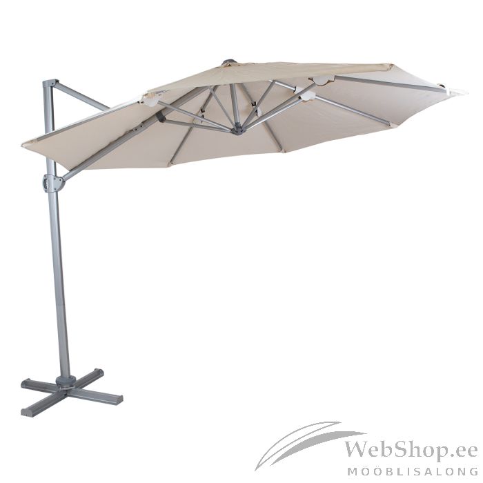 Päikesevari ROMA D3m beež. Kuumal suvepäeval pakub päikese eest leevendust päikesevari, mis loob meeldiva varjualuse lõõgastumiseks. Tootel on pöörlemisfunktsioon. Päikesevari on kaetud beeži polüesterkangaga 180g/m². Varju alumiiniumjalg koosneb kaheosalisest torust 80x53x2mm ning kaheksast terasribist 27x15mm/24x12mm. Jalg on kaetud hõbedase pulbervärviga. Komplekti kuulub metallist alusrist ilma lisaraskuseta. Lisaraskuseks soovitame juurde päikesevarjualuse kive koodiga 11786 või plastikust päikesevarju alust koodiga 11790. Päikesevarju kogumõõdud on D3xH2,6m. HOOLDUS: enne päikesevarju kokku pakkimist peab sellel laskma täielikult kuivada. Toodet peaks hoiustama kuivas ja varjulises ruumis. See võimaldab tagada toote pikema eluea. HOIATUS: toode ei ole mõeldud kaitseks vihma eest ega kasutamiseks tugeva tuule korral.