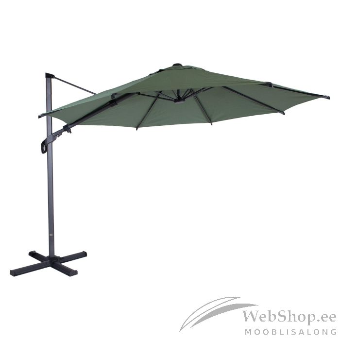 Päikesevari VIENNA D3m, roheline. Päikesevarju kate on valmistatud polüesterkangagast 180g/m². Varjul on terasribid 12x18mm/12x20mm ja terasest jalg 75x52mm. Ribid ja jalg on kaetud tumehalli pulbervärviga. Päikesevari on vändaga avatav. Komplekti kuulub metallist alusrist ilma lisaraskuseta. Lisaraskuseks soovitame juurde päikesevarjualuse kive koodiga 11786. HOIATUS: toode ei ole mõeldud kasutamiseks tugeva tuule või vihma korral. Ärge jätke avatud päikesevarju järelevalveta. HOOLDUS: hoiustage kuivas, hea ventilatsiooniga ruumis. Enne päikesevarju hoiule panemist laske sel täielikult kuivada.