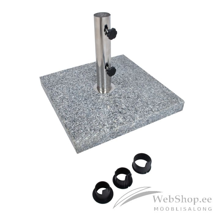 Päikesevarjualus 45x45cm/30kg. Päikesevarjualus on valmistatud graniidist ja poleeritud. Roostevabast terasest kinnitustoru pikkus on 30cm. Toru otsas on 3 plastikrõngast D35/38/48mm. Valige päikesevarjujala mõõduga sobiv rõngas. HOIUSTAMINE: suvehooaja lõppedes soovitame päikesevarjualuseid hoiustada siseruumides. Kasutage hoiustamiseks jahedat, kuiva ning hea ventilatsiooniga ruumi.
