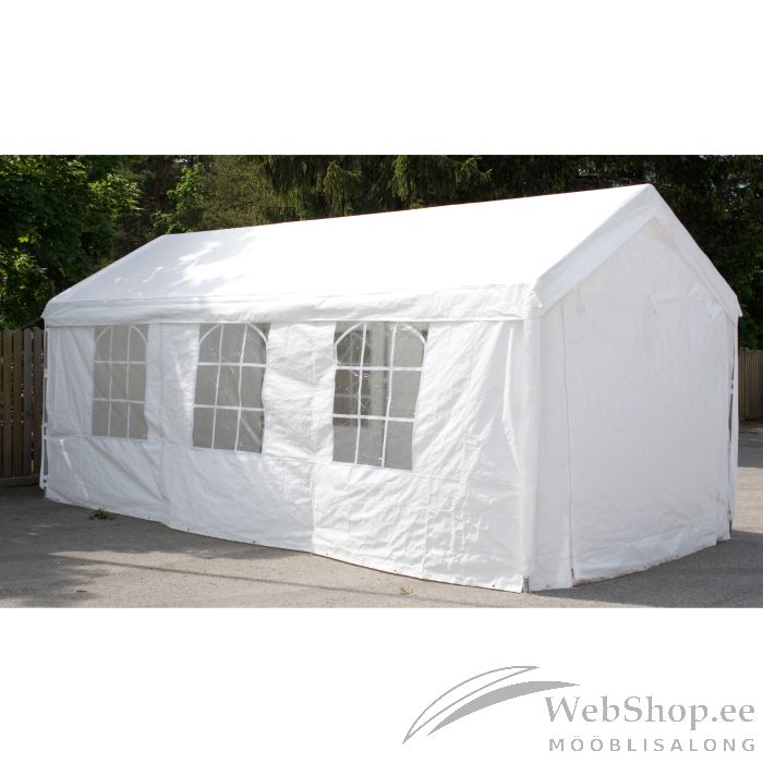 Peotelk 3x6m valge. Peotelk loob kindluse välisündmuste tähistamiseks heitlikes ilmastikuoludes. Telk pakub leevendust kuuma päikese eest ja ka kergemate tuulepuhangute korral. Ühtlasi võimaldab see leida varjualuse kergema vihmasaju eest. Vihma ja tuule korral saab telgi kõik sissepääsud sulgeda tõmblukkude või teiste kinnitustega. Soovi korral saab seinu ka eemaldada, mis võimaldab jahutaval tuulel vabalt liikuda. Peotelk on piisavalt ruumikas, et mahutada nii pikad peolauad kui ka aiadiivani ja tugitoolid. Telk on kaetud valge polüeteenkattega 180g/m². Telgi raam on valmistatud terasest. Tugipostide mõõdud on D38x0,75mm. Peotelgi kogumõõdud on 3x6xH2,02/2,82m. HOOLDUS: hoiustage toodet kuivas ja varjulises ruumis. Enne telgi kokku pakkimist veenduge, et toode on täielikult kuiv. HOIATUS: peotelk tuleb kasutamisel fikseerida aluspinnale. Toode ei ole mõeldud kasutamiseks tugeva tuule ja vihma korral.