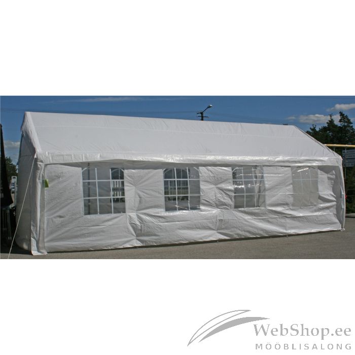 Peotelk 4x8m, valge PE. Peotelk loob kindluse, et välisündmuste korraldamine õnnestub ka halva ilmaga! Telgi pindala on 32m², telgi kõrgus külgedel 2m ja keskel 3,04m. Telgi tugikonstruktsioon ja kõik vaheliigendid on valmistatud metallist, mis tagab piisava vastupidavuse ja pikema kasutusaja. Terasest tugipostide mõõdud on D38x0,75mm. Kõik raami osad on pulbervärvitud. Telgi katus ja küljeseinad on valmistatud polüeteenist (PE 180g/m²). Mõlemad küljeseinad koosnevad ühest 4-aknaga paneelist. Telk on hea ilmastikukindlusega, kuid mitte täielikult veekindel. Ärge kasutage telki tormise ilma ja väga tugeva vihmasaju korral. Tormikahjude vältimiseks eemaldage võimalusel nii katus kui seinad. HOIUSTAMINE: suvehooaja lõppedes monteerige telk lahti ja hoiustage siseruumides. Puhastage ja kuivatage telk enne hoiule panekut. Kasutage hoiustamiseks kuiva ning hea ventilatsiooniga ruumi. Seadusega ettenähtud pretensioonide esitamise õigus on kehtiv juhul, kui kõikidest kasutus- ja paigaldusnõuetest on kinni peetud ja toode ei ole kahjustunud ekstreemsete ilmastikuolude mõjul.
