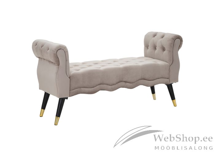 Stiilne halli värvi sametist kattega pink. Pingi jalad on kuldset tooni metallist ja musta tooni puidust. Detailid kulla tooni metallist. Istme pehmenduseks poroloon.