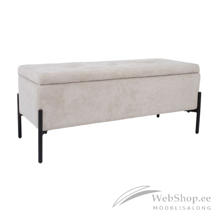 Pink RORI panipaigaga 95x35xH41cm, bee˛. Pingi iste ja korpus on polsterdatud ja kaetud polüesterkanaga. Pingi jalad on valmistatud metallist ja viimistletud musta pulbervärviga. Panipaiga sügavus 18cm.