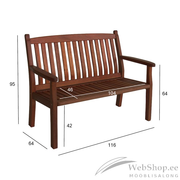 Pink WINDSOR tumepruun. Pink on mugav ja ruumi säästev lahendus väiksemale terrassile või aeda. Sellel on meeldiv päeval kaunist ilma nautida või õdusaid õhtuid veeta. Pink on valmistatud merantipuidust ning on õliviimistlusega. Toode on muutlikes ilmastikuoludes vastupidav. Pingi mõõdud on 116x64xH95cm. HOOLDUS: puit on elav looduslik materjal, mille välisilme ilmastikutingimuste tõttu muutub. Puhastage mööblit regulaarselt, kaitske liigniiskuse ja UV kiirguse eest. Kerge lihvimine ja uus õlikiht vähemalt korra aastas on piisav värskenduskuur mööblile uue näo andmiseks.