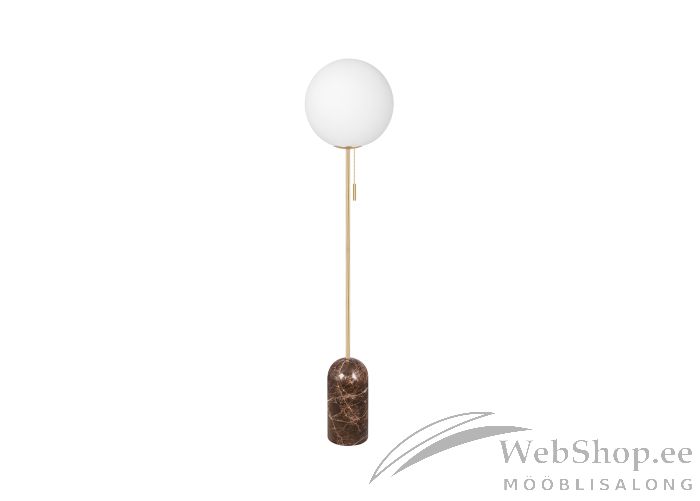 Valget värvi opaalklaasist kupliga põrandalamp. Lambi jalg on pruuni värvi marmorist ja messingu tooni metallist. Lambile sobib elektripirn max 60W, sokliga E27. Valgusallikas ei kuulu komplekti. Lüliti asub lambi peal. Kaabel on 200cm. Skandinaavia disain.