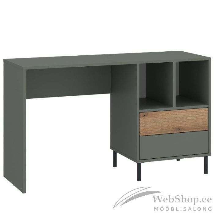 Kirjutuslaud on valmistatud salveirohelises toonis lamineeritud puitlaastplaadist. MDF-ist puitu imiteeriv esiosa on valmistatud soonetehnikas. Riiulite ja kahe mahuka sahtliga kirjutuslaud tagab ergonoomilisuse igapäevaseks kasutamiseks. Sahtlite jaoks kasutatav kaasaegne push-to-open süsteem on mugav ning kerge.