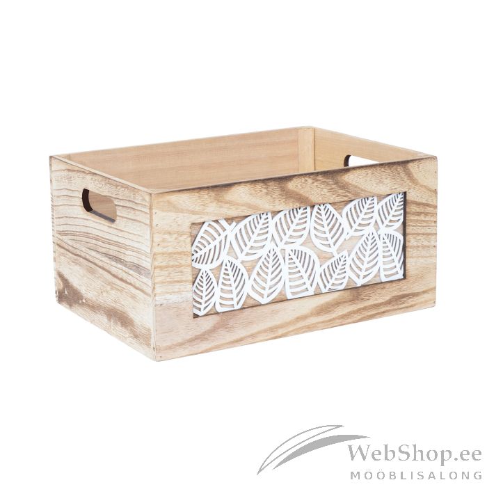 Puitkast KASEKE 36x26x18cm, naturaalne. Kast on valmistatud vineerist ja täispuidust. Üks küljepaneel on kaunistatud valgete lehemotiividega. Kergelt põletatud ja vanutatud pinnaviimistlust toob puidusüü naturaalse ilu kaunilt esile.