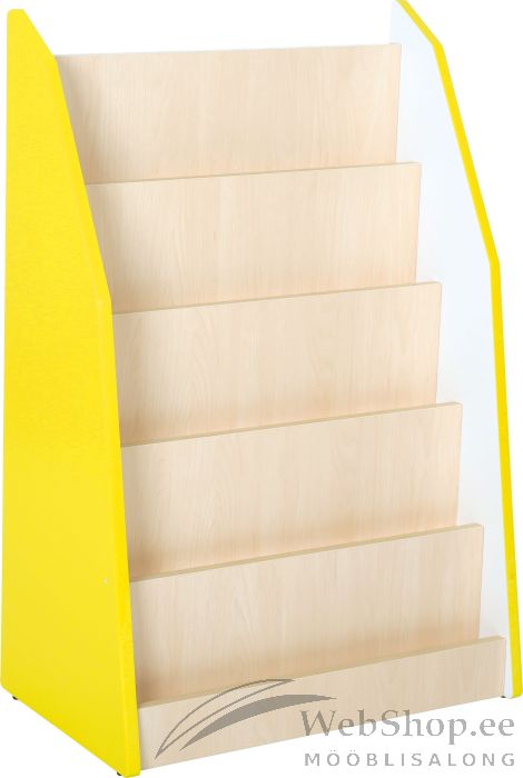 Püstine ühepoolne raamaturiiul. Tehtud lamineeritud saepuruplaadist (paksus: 18 mm), ja värvilisest kiletatud MDF-plaadist (paksus: 18 mm). • mõõtmed 60 x 35 x 89 cm • 5 riiulit kummalgi poolel (sügavus: 4 cm)