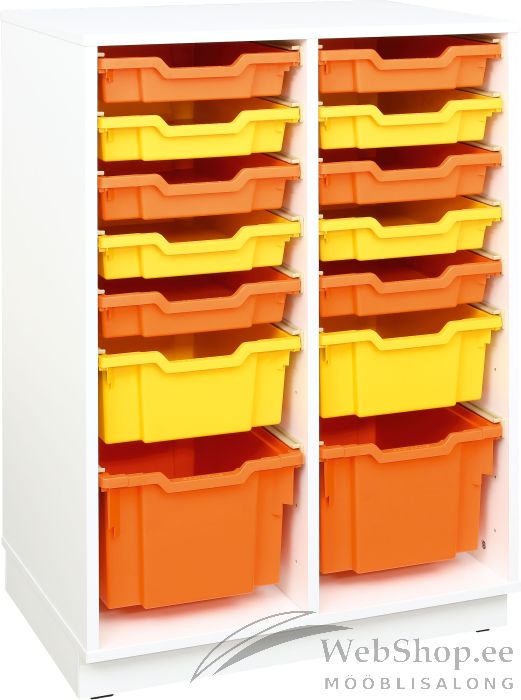 Riiulite komplekt koosneb QUADRO M+ riiulist ja 6 punasest madalast plastikust kastist, 4 kollasest madalast plastikust kastist, 2 kollasest sügavast kastist ja 2 punasest suurest plastikust kastist.  Komplekt on saadaval valge korpusega ning valge ja vahtra korpusega. Riiulikomplekt on stabiilne ja väga mugav igapäevaseks kasutamiseks.