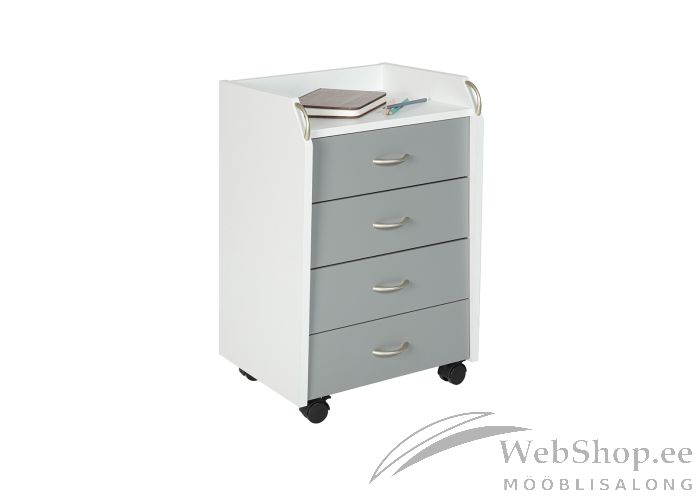 Kaasaegse ja ajatu disainiga sahtliboks. Boks on valmistatud melamiinkattega valget ja halli värvi mööbliplaadist. 4 mahukat metallist siinidel sahtlit asjade paigutamiseks. 4 plastikust ratast, et boksi oleks võimalikult lihtne mööda tuba liigutada.