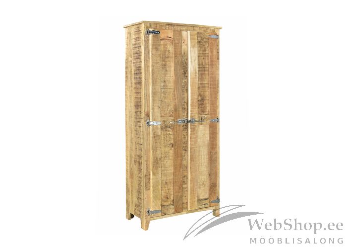 Mangopuidust valmistatud riidekapp. Viimistlus: naturaalne. 2 ust. Mõlema ukse taga on toru riiete riputamiseks ja 2 riiulit. Iga toode on originaalne ja võib erineda pildil olevast, sest on naturaalsest puidust.
