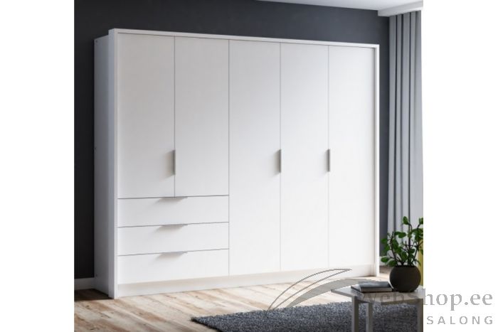 Viie ukse ja kolme mahuka sahtliga riidekapp on valmistatud vastupidavast ja kvaliteetsest melamiimkattega laminaadist. Uksed tagavad täieliku ligipääsu kõigile kapiosadele. Valikus kaks erinevat värvi