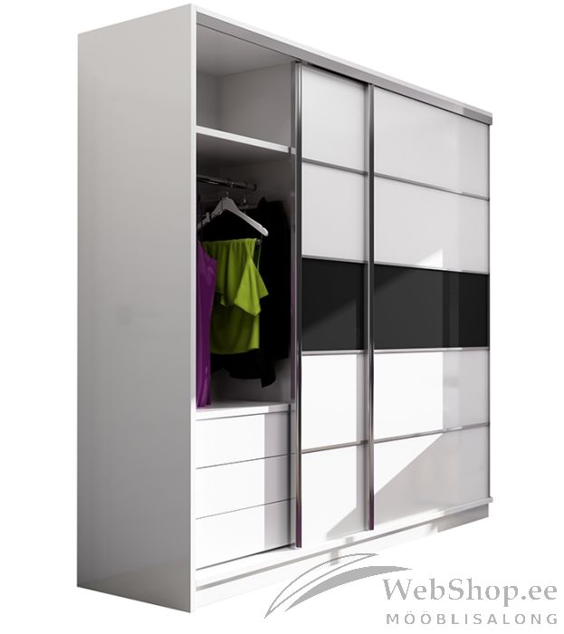 Kahe lükanduksega kõrge riidekapp on valmistatud vastupidavast ja kvaliteetsest melamiimkattega laminaadist. Uste sujuva liikumise alumiiniumist reelingul tagavad kuullaagritel juhikud. Valgetel ustel on kasutatut disaini elemendina musta või lillat klaas.