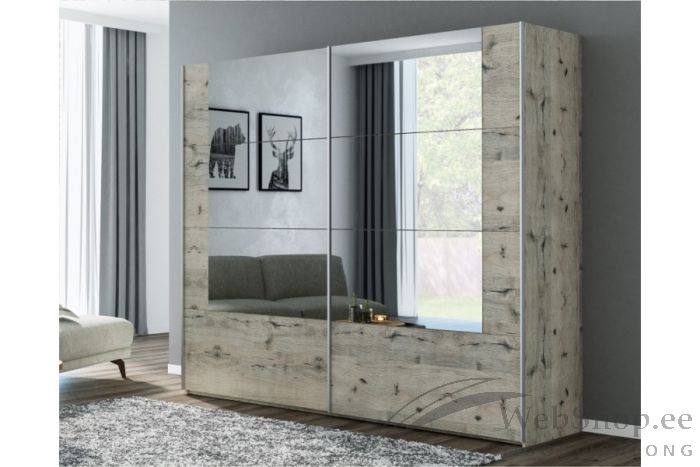 Kahe lükanduksega riidekapp on valmistatud vastupidavast ja kvaliteetsest melamiimkattega laminaadist. Uste sujuva liikumise alumiiniumist reelingul tagavad kuullaagritel juhikud. Ustel on kasutatut disaini elemendina peeglit.