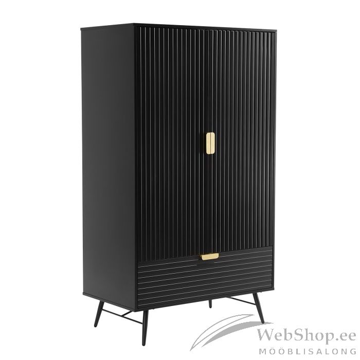 Riidekapp PIXAR 2-ukse ja sahtliga 100x56xH175cm, must. Mööbliplaadist valmistatud riidekapp on viimistletud musta polüuretaanvärviga. Ribipaneelist uste ja sahtli esipaneelid ning kuldsed käepidemed annavad pilkupüüdva välimuse. Kapi jalad ja alusraam on valmistatud metallist.