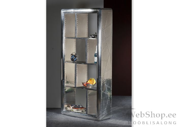 Mangopuidust karkassiga ja MDF-mööbliplaadist riiulitega riiul. Riiul on kaetud hõbedast värvi alumiiniumiga. 8 avatud riiulit. Toode on inspireeritud lennundusest. Toodetud Indias.